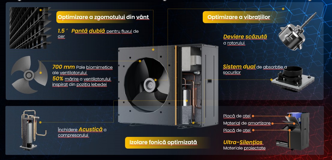 Un ventilator cu pale biomimetice inspirat din pozitia lebedei vine sa completeze o matrice de ventilatie optimizata Fibonacci facand astfel din pompa de caldura Solax una dintre cele mai performante pompe de caldura.